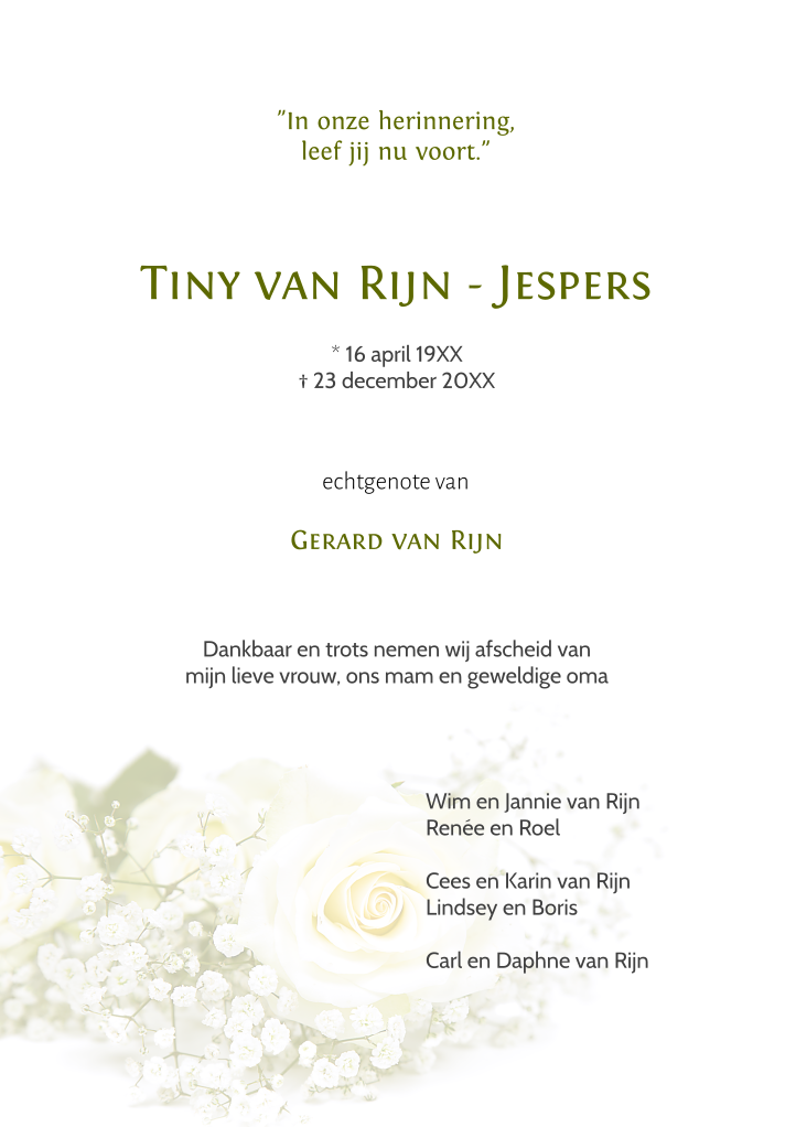 Prachtige rouwbrief met subtiele foto van rozen. Pas deze brief aan naar wens.