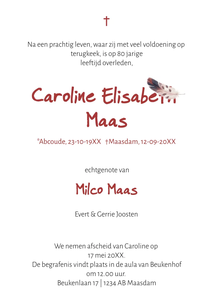 Moderne rouwbrief in A5 formaat met rode accenten en handgeschilderde veer.