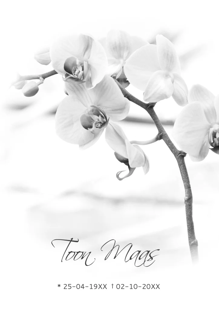 Rouwbrief met foto van orchidee in zwart-wit. Deze briefkaart is naar wens aan te passen.