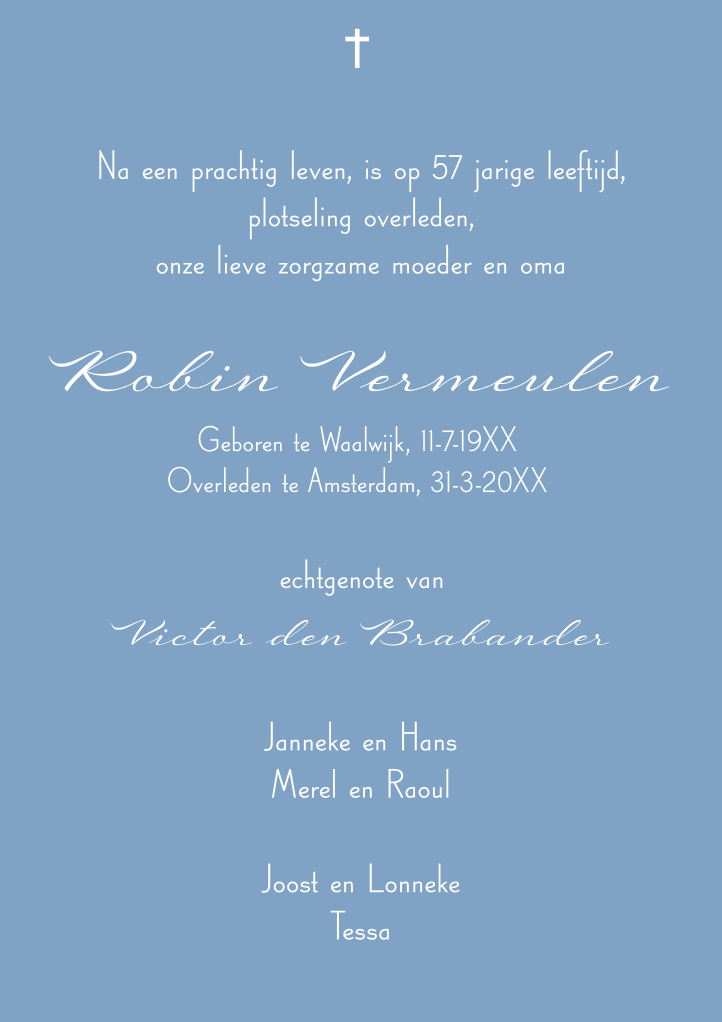 Stijlvolle rouwbrief in stijlvol blauw en met prachtige vlinder details aan de binnenzijde.