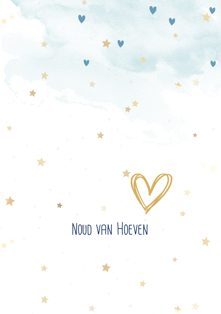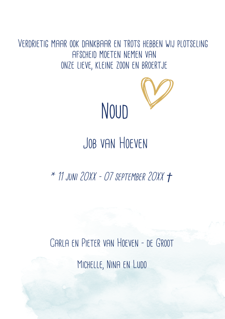 Rouwbrief met goudkleurige sterretjes en grijs-blauwe waterverf achtergrond. Plaats aan de binnenkant een persoonlijke foto.