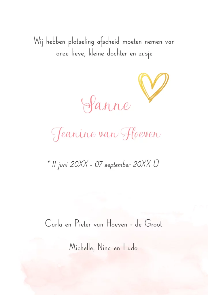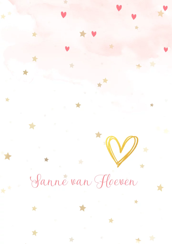 Rouwbrief met goudkleurige sterretjes, aquarel en hartje. Plaats aan de binnenkant je eigen foto.