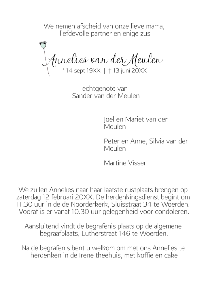 Klassiek ontwerp van rouwbrief met tuinbloemen tekening en aquarel streken. De portret foto is aan de binnenkant.