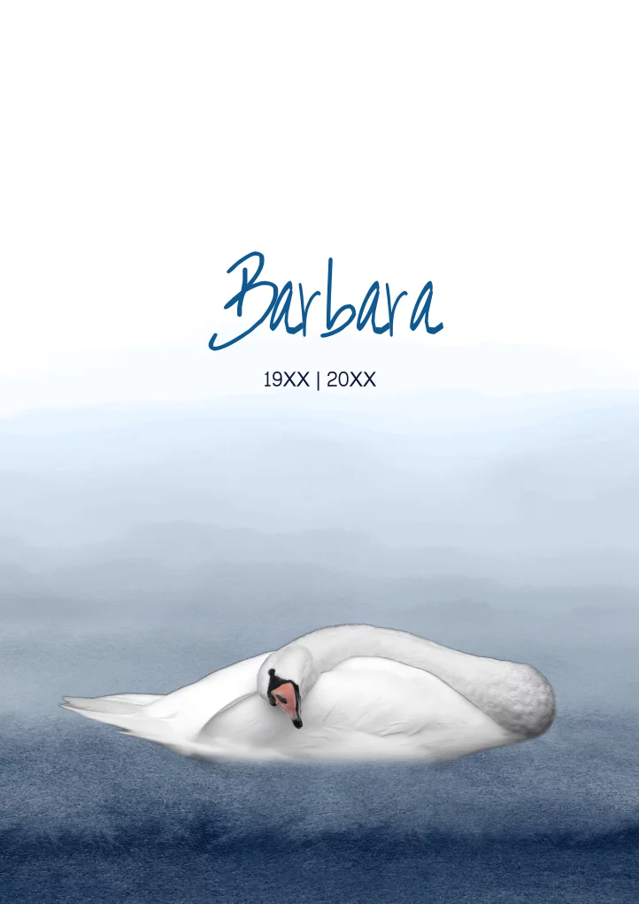 Rouwbrief met blauwe achtergrond en een vrijstaande zwaan