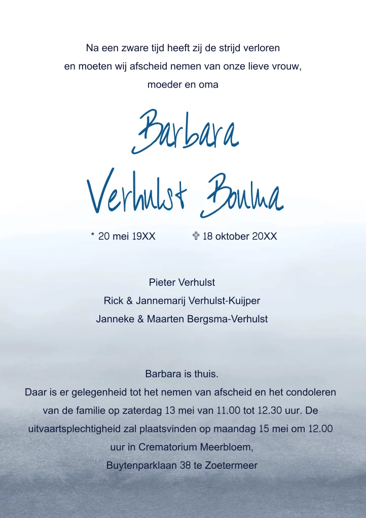 Rouwbrief met aquarel-achtergrond in blauw en een vrijstaande zwaan.