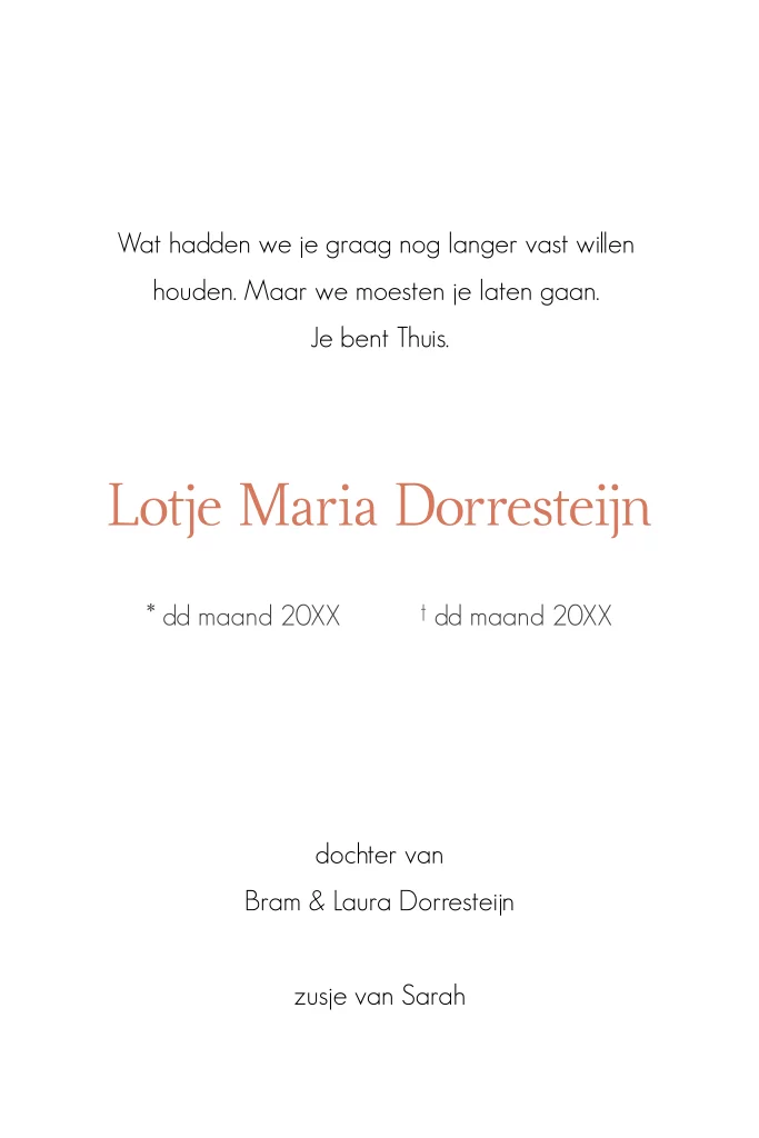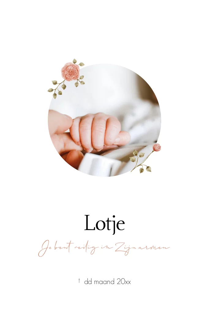 Lieve rouwkaart met roze bloemetjes en de mogelijkheid om voorop een eigen foto te uploaden.