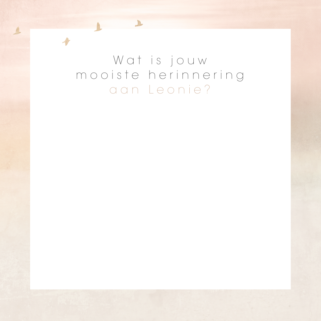 De herinnering blijft. Op een invulkaartje kun je mensen vragen een persoonlijke herinnering op te schrijven die ze hebben aan de overledene. Hoe mooi is een handgeschreven aandenken. Zeer dierbaar voor de nabestaanden om te bewaren en te koesteren.