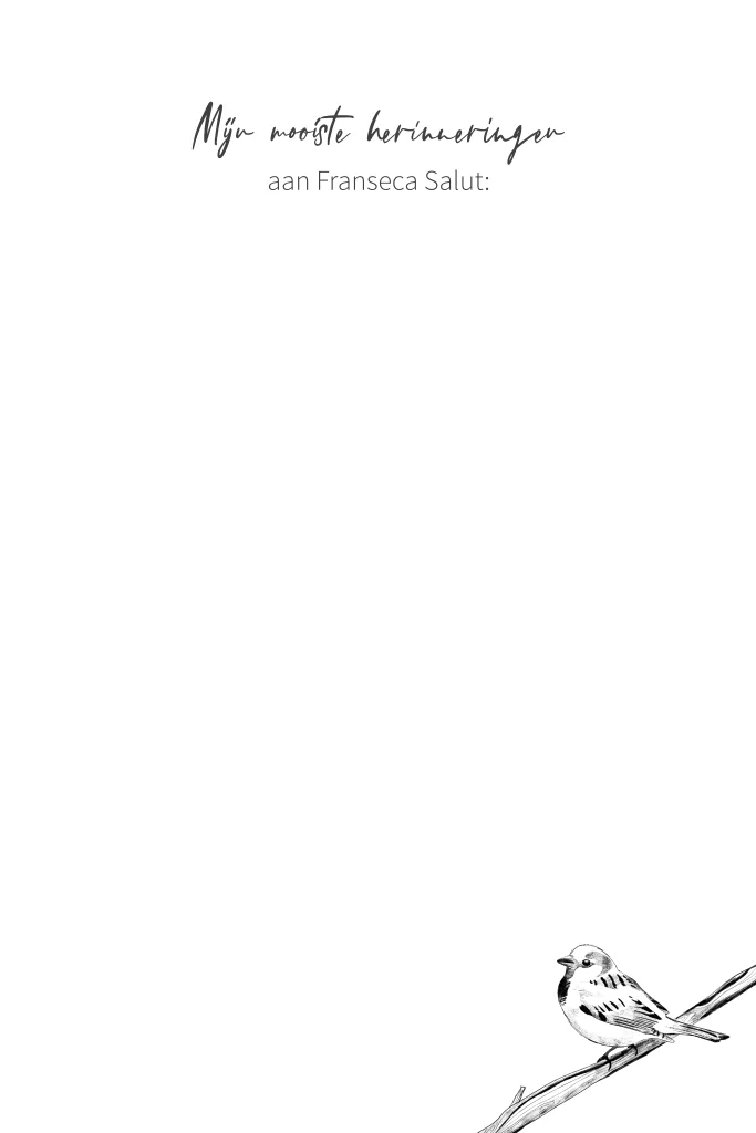 De herinnering blijft. Op een invulkaartje kun je mensen vragen een persoonlijke herinnering op te schrijven die ze hebben aan de overledene. Hoe mooi is een handgeschreven aandenken. Zeer dierbaar voor de nabestaanden om te bewaren en te koesteren.