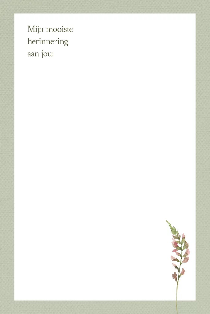 Invulkaart voor herinnering met een groene linnen achtergrond en een klein bloem takje.