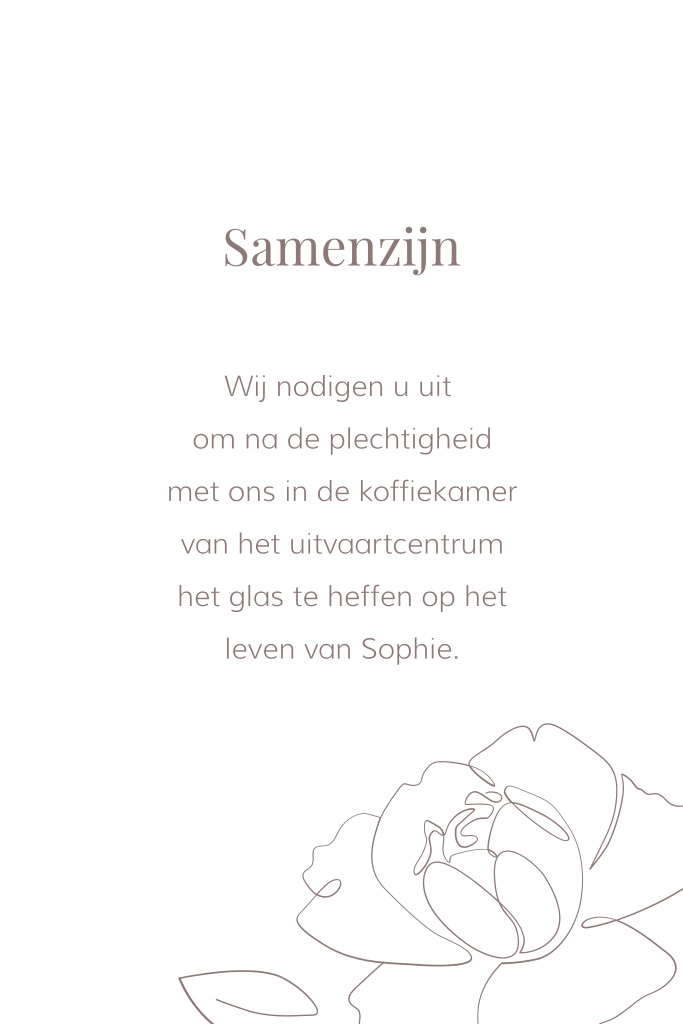 Uitnodiging voor samenzijn na de plechtigheid. Dit extra kaartje is overwegend wit en clean met een oneline illustratie van een roos.
