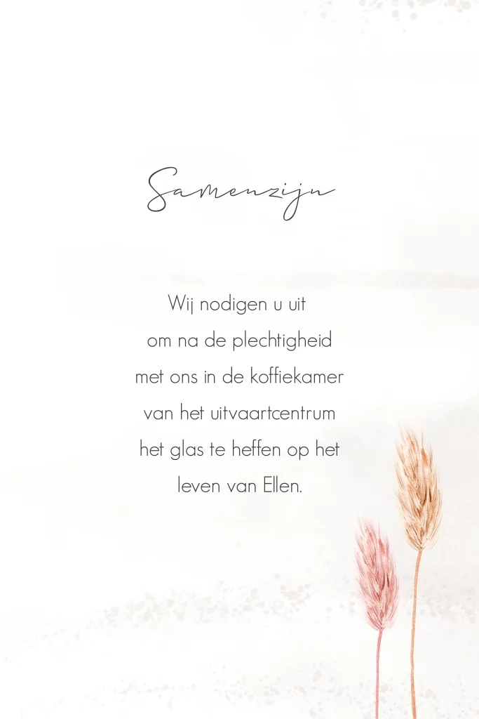 Je kunt een klein kaartje toevoegen in de stijl van de rouwkaart. Hierop kun je familie en vrienden uitnodigen voor het samenzijn na de begrafenis of crematie.