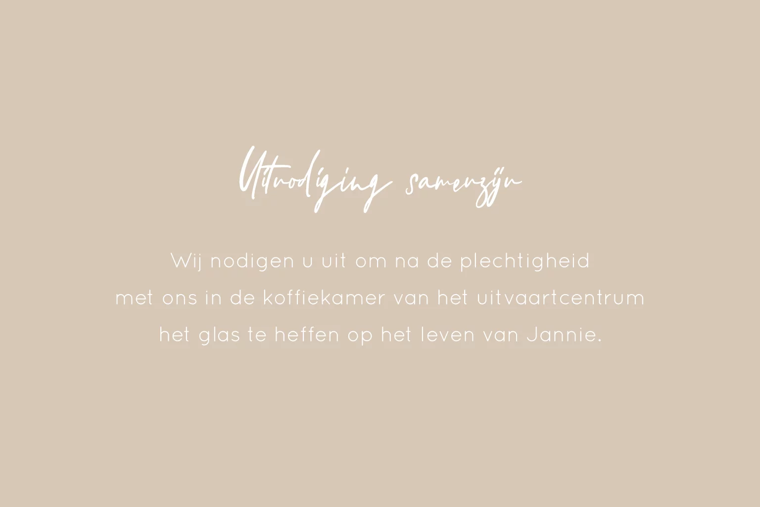 Je kunt een klein kaartje toevoegen in de stijl van de rouwkaart. Hierop kun je familie en vrienden uitnodigen voor het samenzijn na de begrafenis of crematie.