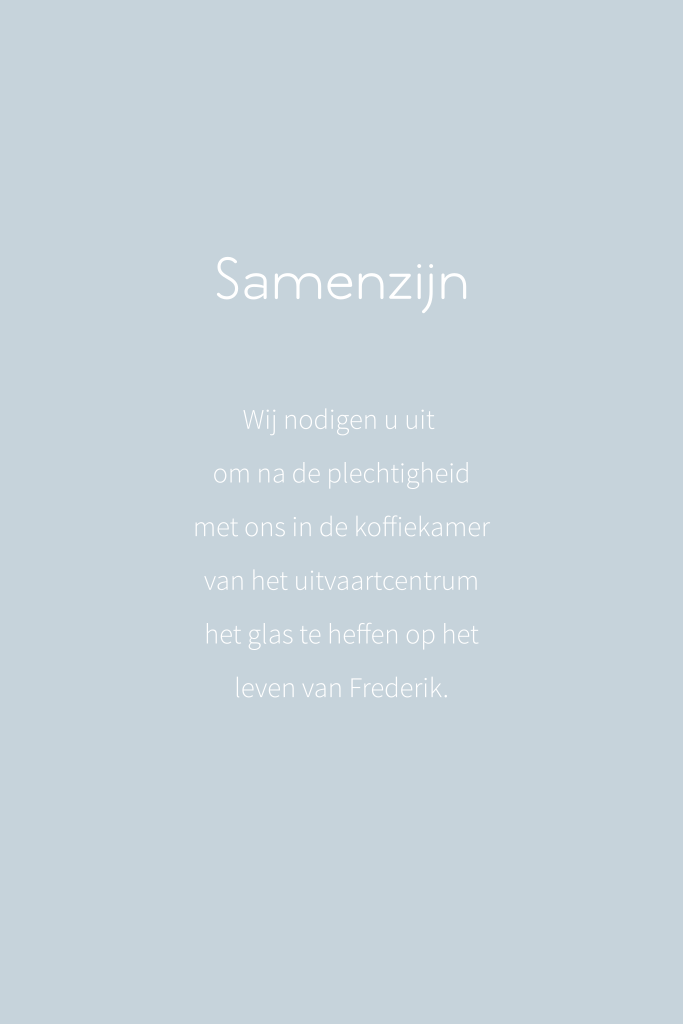 Uitnodiging voor samenzijn na de plechtigheid. Dit basic extra kaartje is heeft witte letters voor een ijsblauwe achtergrond.