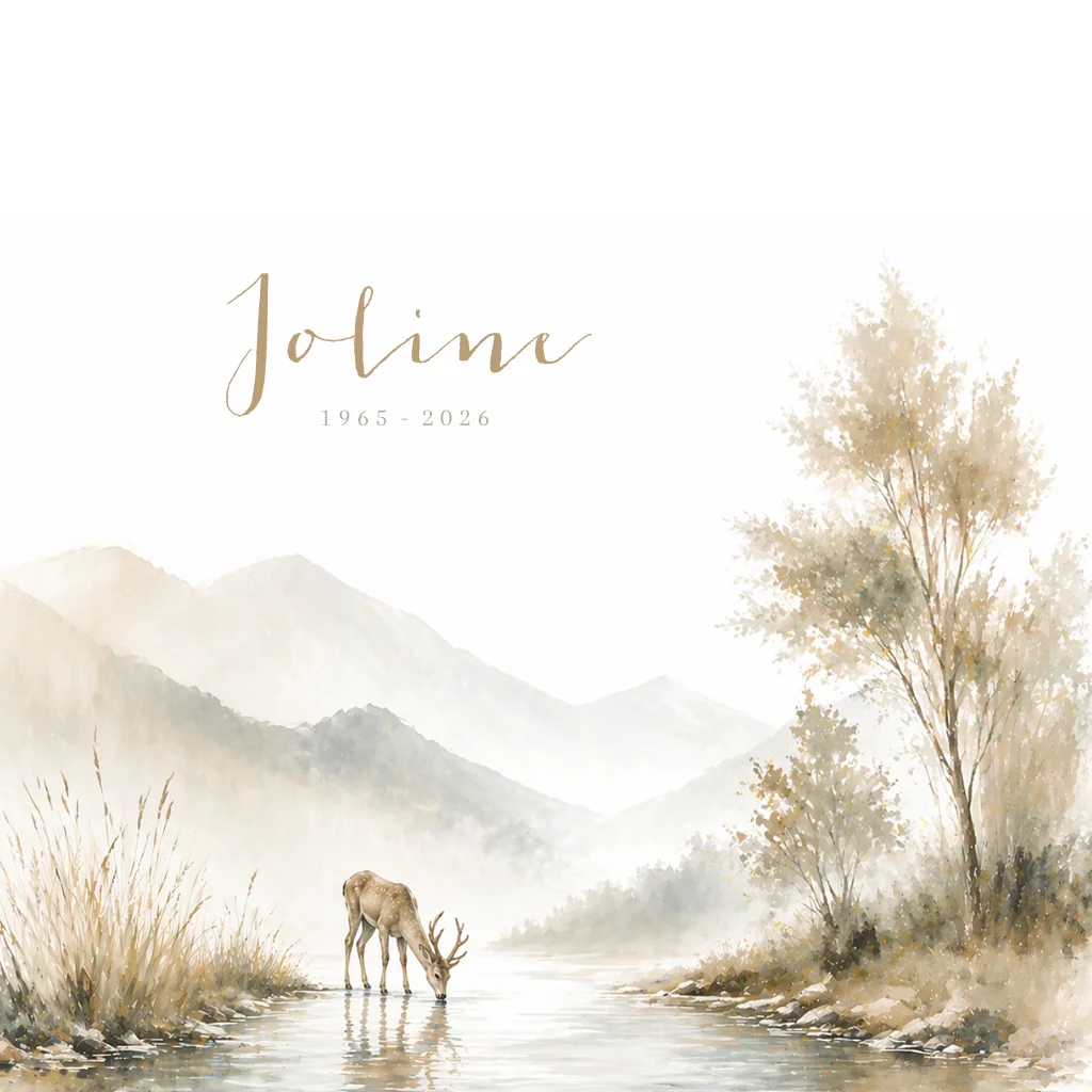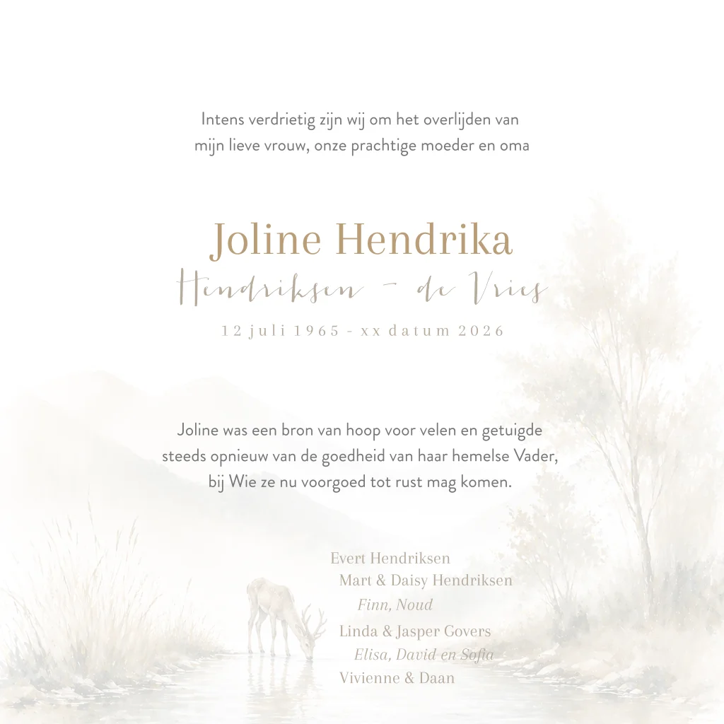 Een christelijke rouwkaart in beige tinten met een illustratie van een hertje dat water drinkt. Deze rouwkaart past bij Psalm 42 en het lied 'Als een hert dat verlangt naar water'.