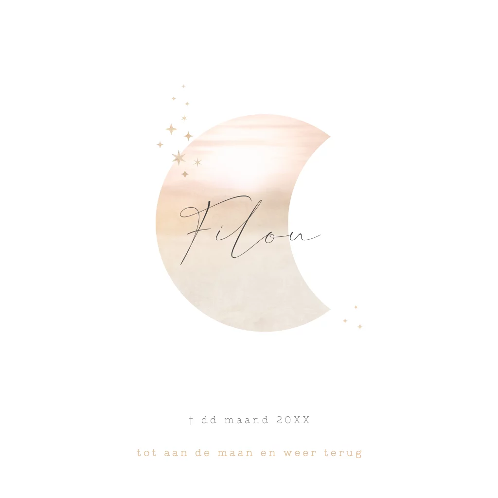 Stijlvolle overlijdenskaart met een aquarel maan en kleine goudkleurige sterretjes voor een kind of baby.