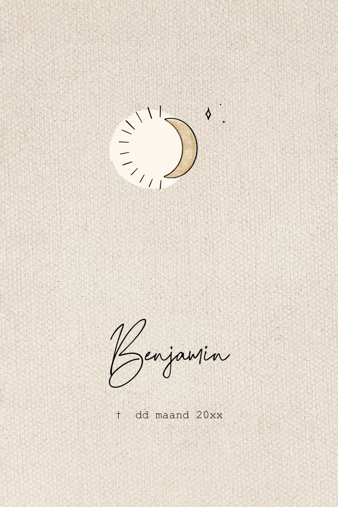 Rustige rouwkaart voor een baby of kind. Met een linnen look achtergrond en op de voorzijde maan en sterretjes. Aan de binnenzijde een foto aan die je eenvoudig vervangt voor een eigen foto.