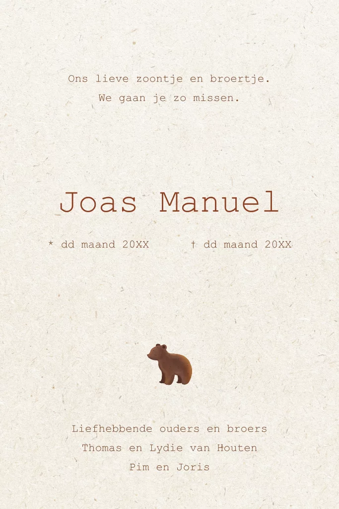 Rouwkaart met eco look achtergrond en een lief beertje die naar de maan en sterretjes kijkt.