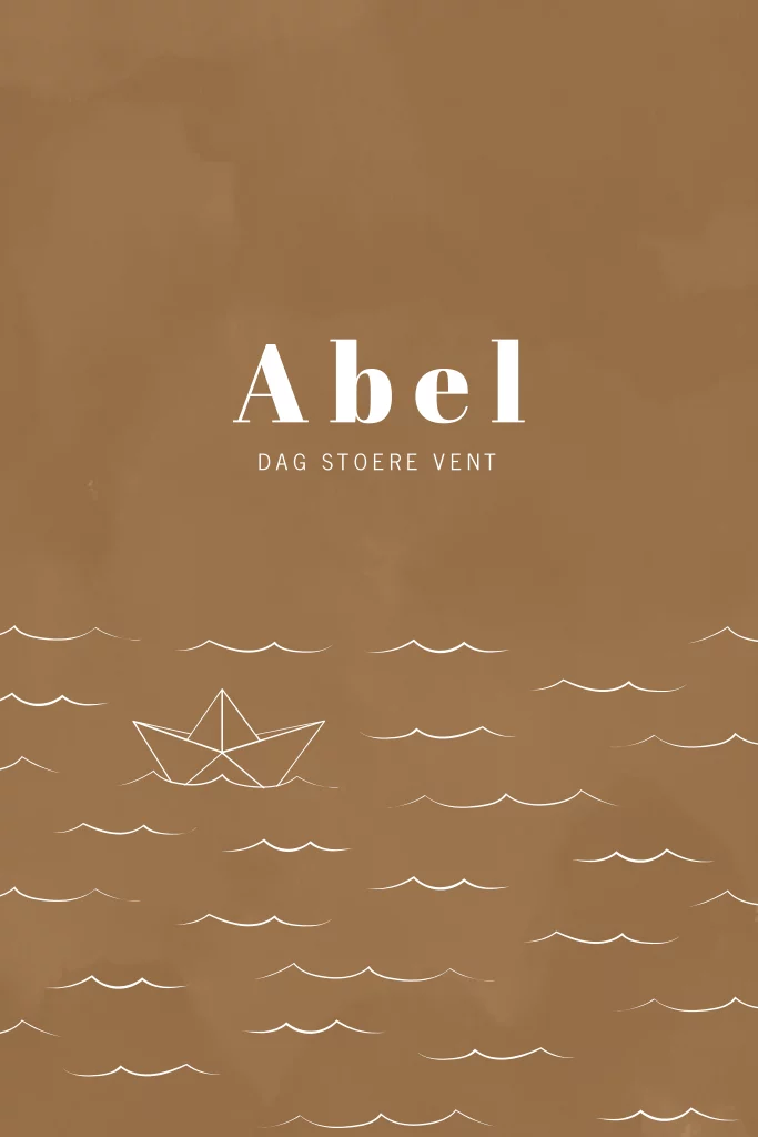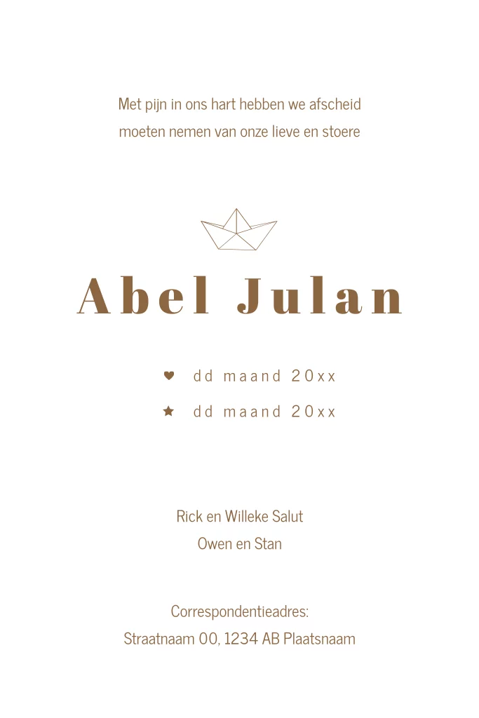 Rouwkaart voor een overleden baby of kind met een papieren bootje die op het water in de oceaan drijft. Op de achtergrond een aquarel in een warme bruine kleur, dit geeft een stoer tintje aan deze overlijdenskaart voor een jongen.