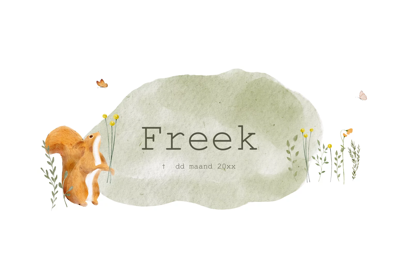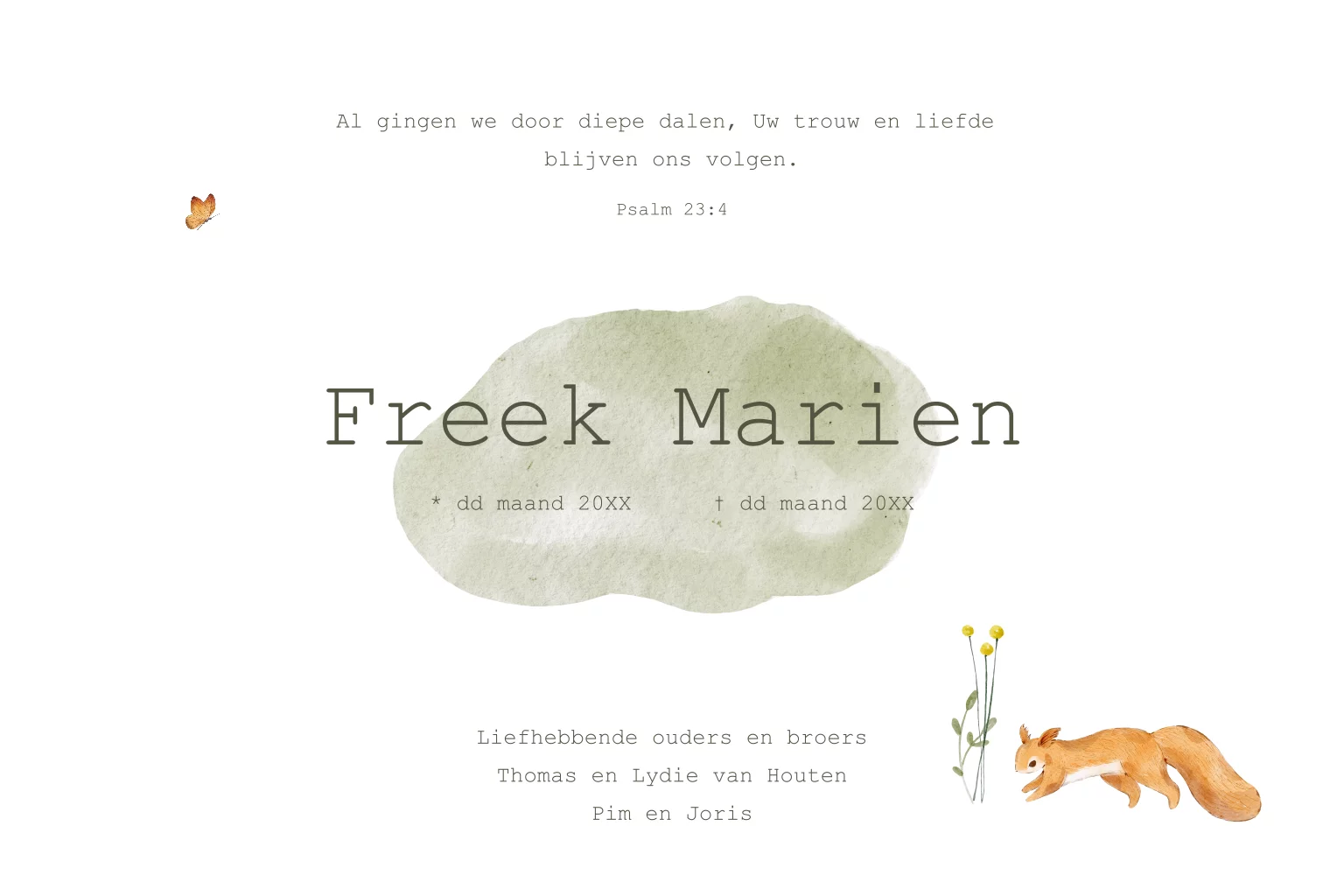 Rouwkaart voor een baby of kindje met een lief eekhoorntje en kleine vlindertjes. Op de binnenzijde is ruimte om een eigen foto toe te voegen.