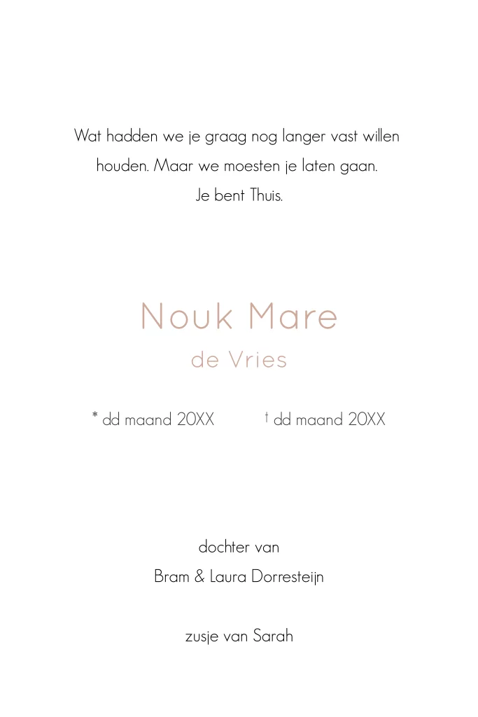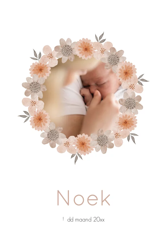 Lieve rouwkaart met een bloemenkrans in roze en bruine tinten en de mogelijkheid om voorop een eigen foto te uploaden.