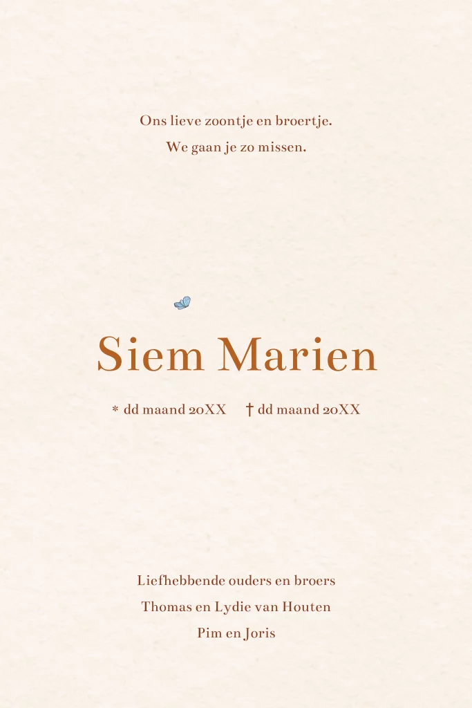 Een mooie en lieve rouwkaart voor een baby of kind. Met een beer en konijn die naar een vlindertje kijken.