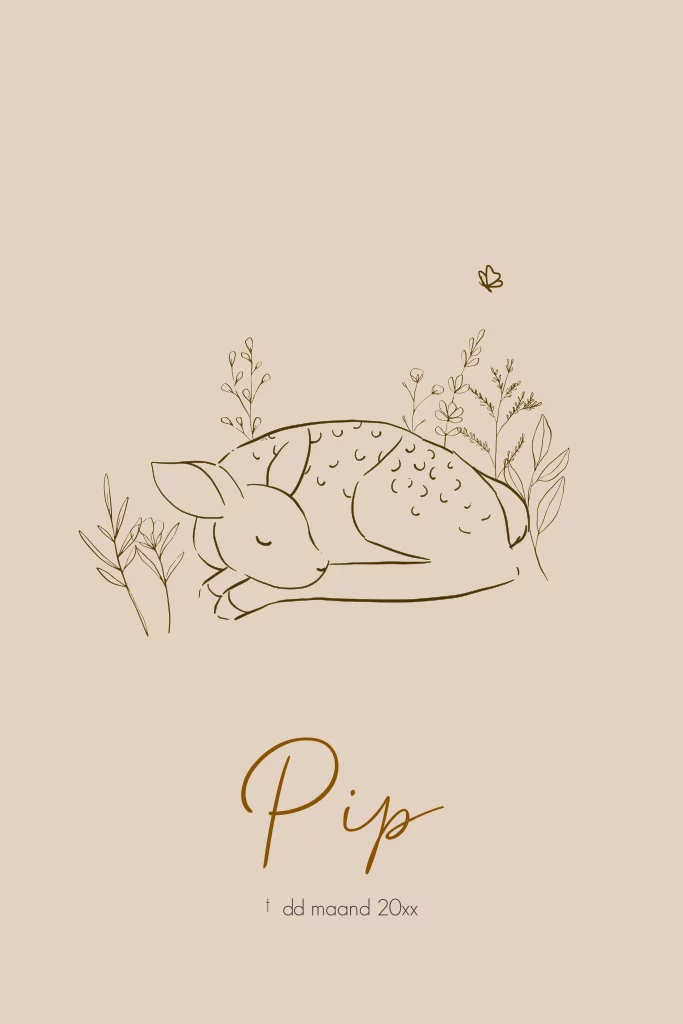 Kinder rouwkaart met een slapend hert tussen de takjes en een klein vlindertje boven het hertje.