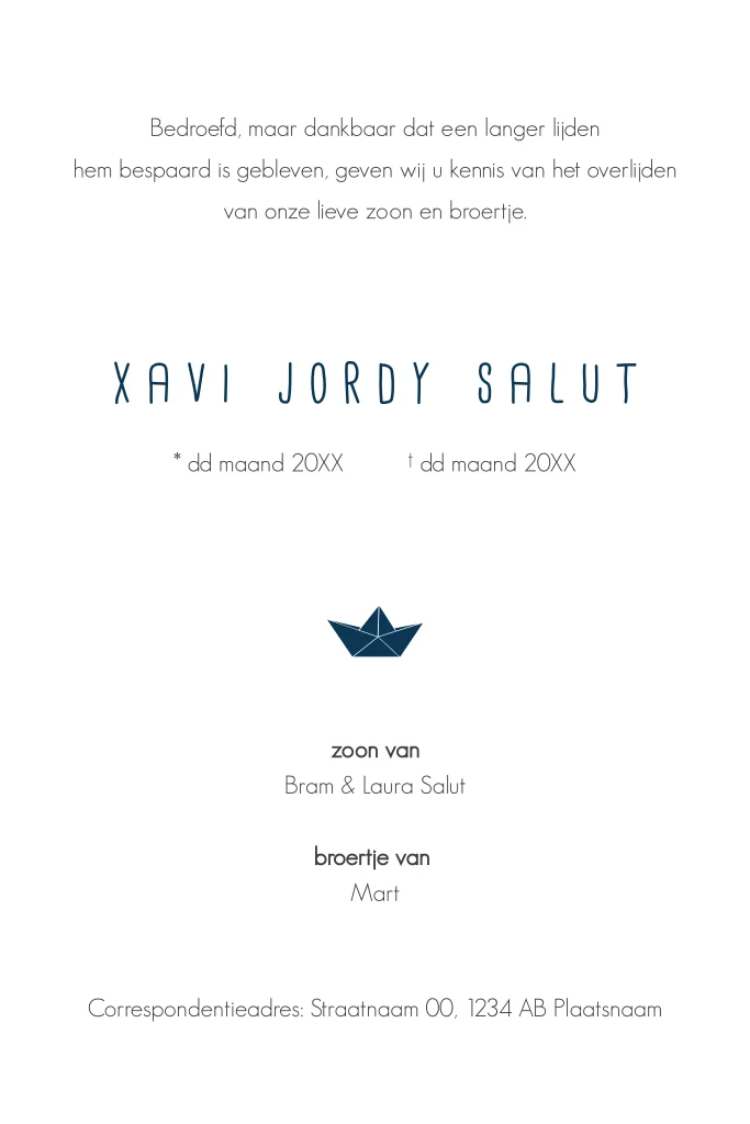 Prachtige rouwkaart voor een kind met een klein papieren bootje, drijvend op de golven van de zee.