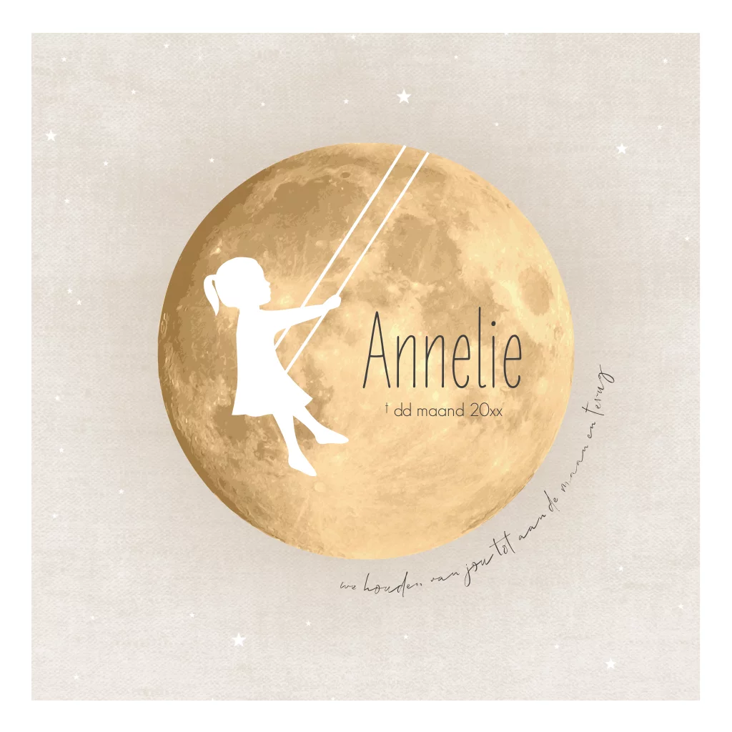 Kinder rouwkaart met silhouet van een meisje op een schommel. Op de achtergrond linnen, een maan en kleine sterretjes.