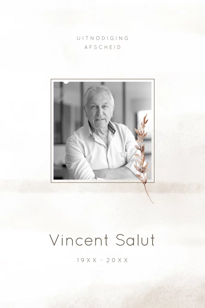 Rustige rouwkaart met foto in kader. Op deze kaart voor de foto een veldbloem takje en op de achtergrond aquarel in natuurlijke kleuren.