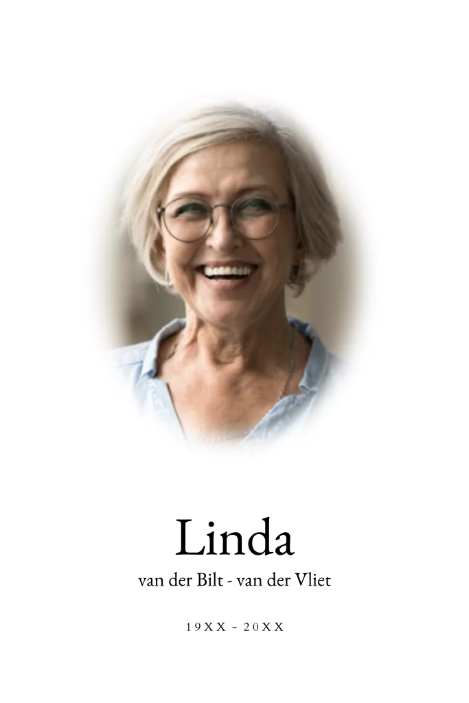 Klassieke rouwkaart met ovale foto en daar omheen een vervaging van de rand.