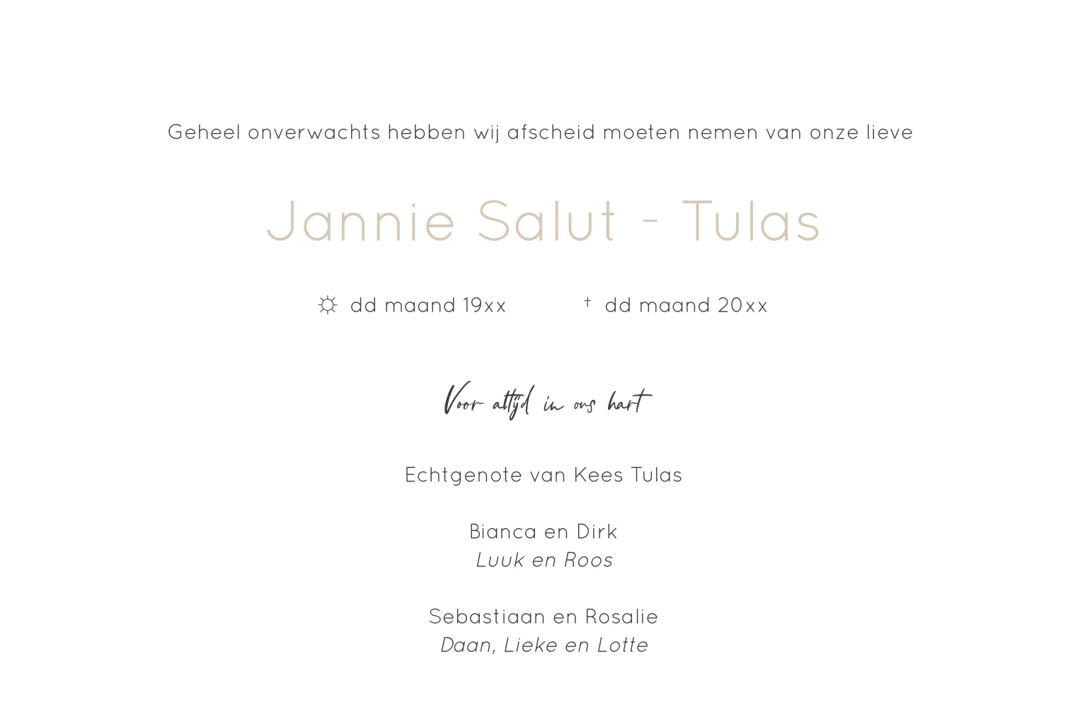 Overlijdenskaart met sfeerfoto van de duinen, het strand, de zee en een wolkenlucht met prachtig zonlicht. Ook is er ruimte voor een eigen foto.