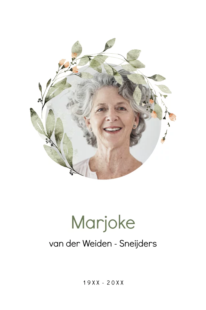 Een sierlijke rouwkaart met bloemenkrans in aquarel stijl. De foto op de voorzijde is makkelijk vervangbaar voor een eigen foto.
