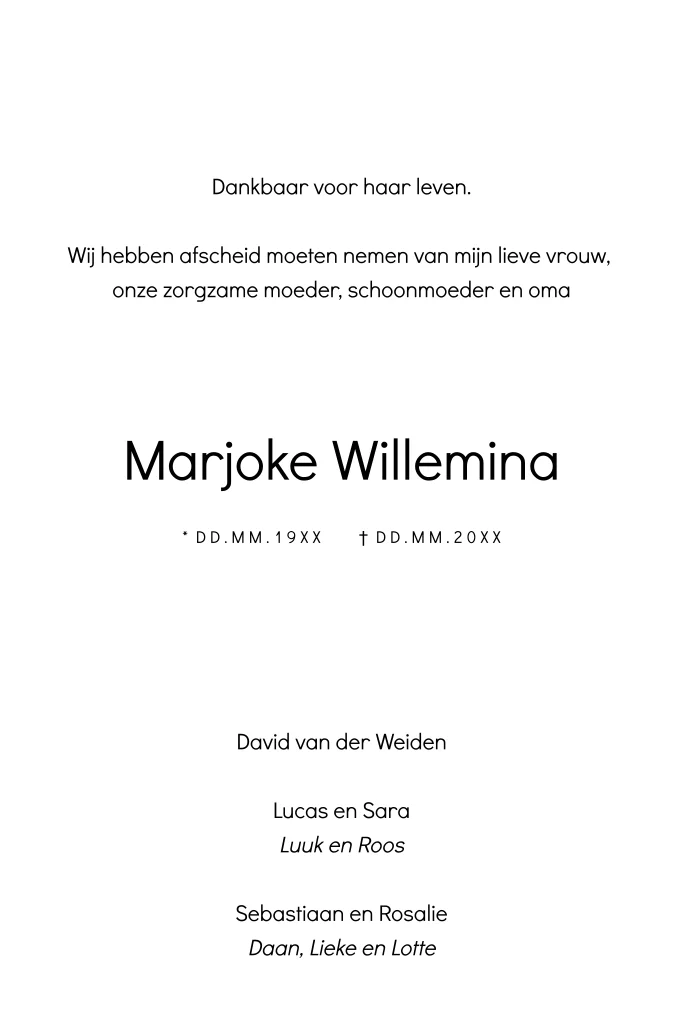 Upload een eigen foto. Pas de teksten, kleuren en lettertypes aan naar je eigen wens. Hulp nodig bij het opmaken van deze kaart? We helpen je er graag bij.