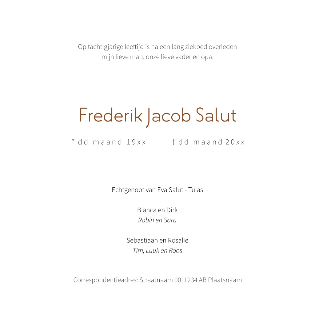 De foto kun je in de editor gemakkelijk vervangen voor een eigen foto. Pas de teksten, kleuren en lettertypes aan naar je eigen wensen.