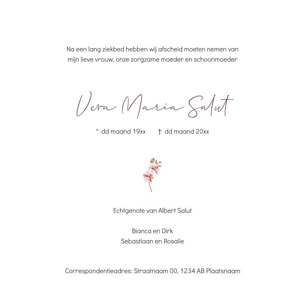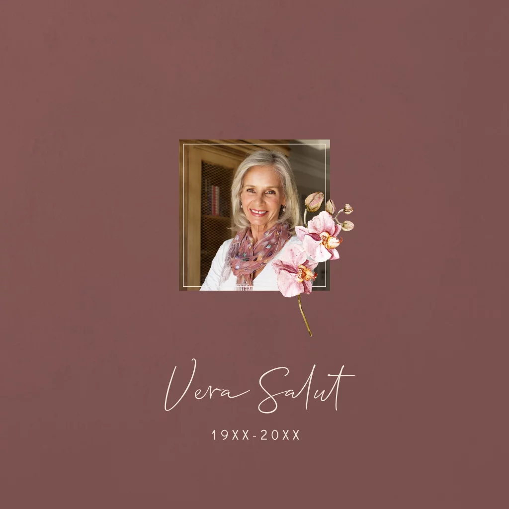 Stijlvolle foto rouwkaart met een aquarel orchidee. Op de achtergrond een warme bordeaux rode kleur en de naam van de overledene staat in een mooi sierlijk lettertype.