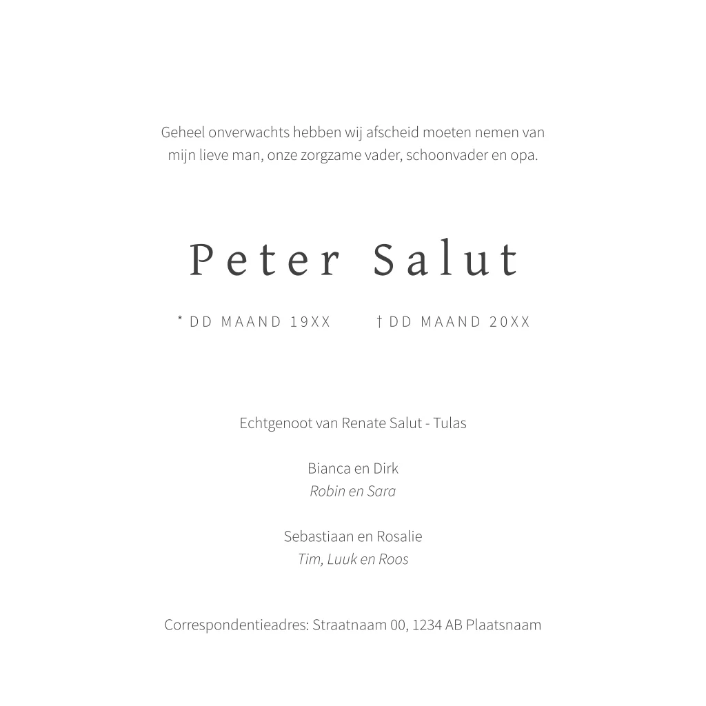 De foto kun je in de editor gemakkelijk vervangen voor een eigen foto. Pas de teksten, kleuren en lettertypes aan naar je eigen wensen.