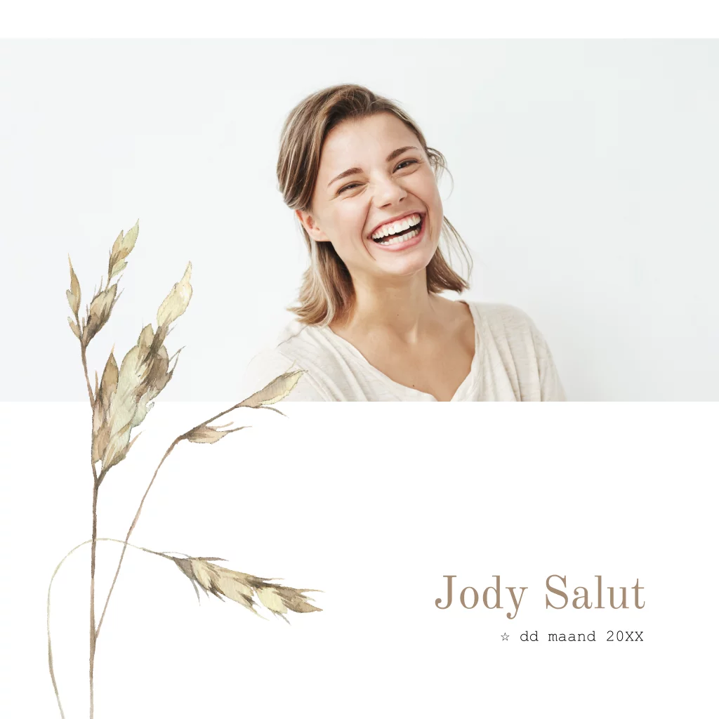 Rustige rouwkaart met een portretfoto en een grasaren in zachte beige tinten.