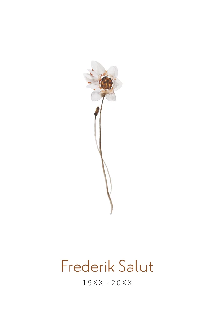 Rouwkaart met een mooie gedroogde aquarel bloem. Deze kaart is overwegend wit en oogt daardoor clean en rustig. Op de binnenzijde is ruimte voor een eigen foto.