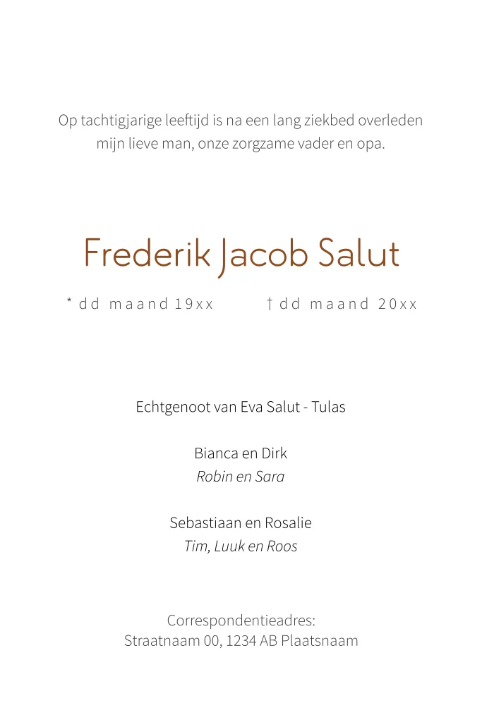 De foto kun je in de editor gemakkelijk vervangen voor een eigen foto. Pas de teksten, kleuren en lettertypes aan naar je eigen wensen.