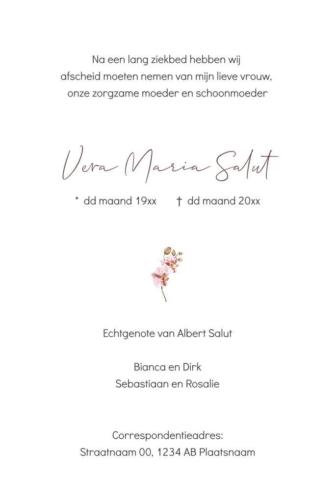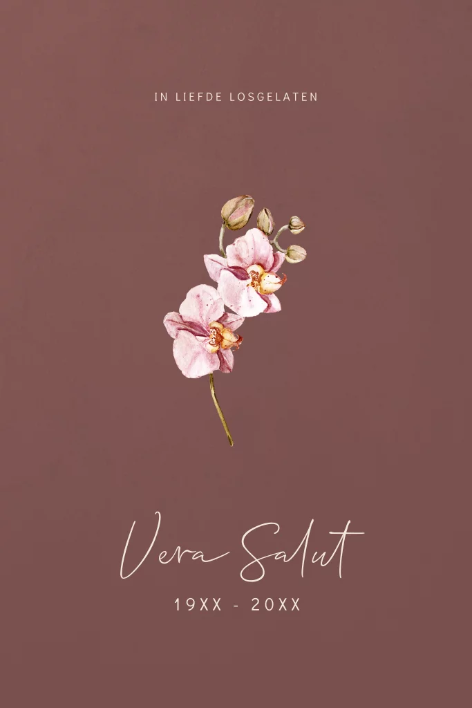 Bloemen rouwkaart met een warme bordeaux rode achtergrondkleur en een aquarel orchidee. De naam van de overledene staat in een mooi sierlijk lettertype.