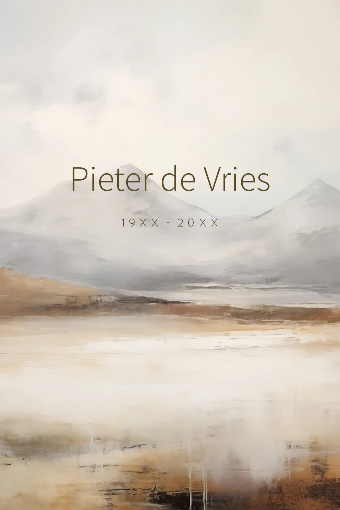 Een rustige rouwkaart met een landschap in warm geschilderde kleuren.