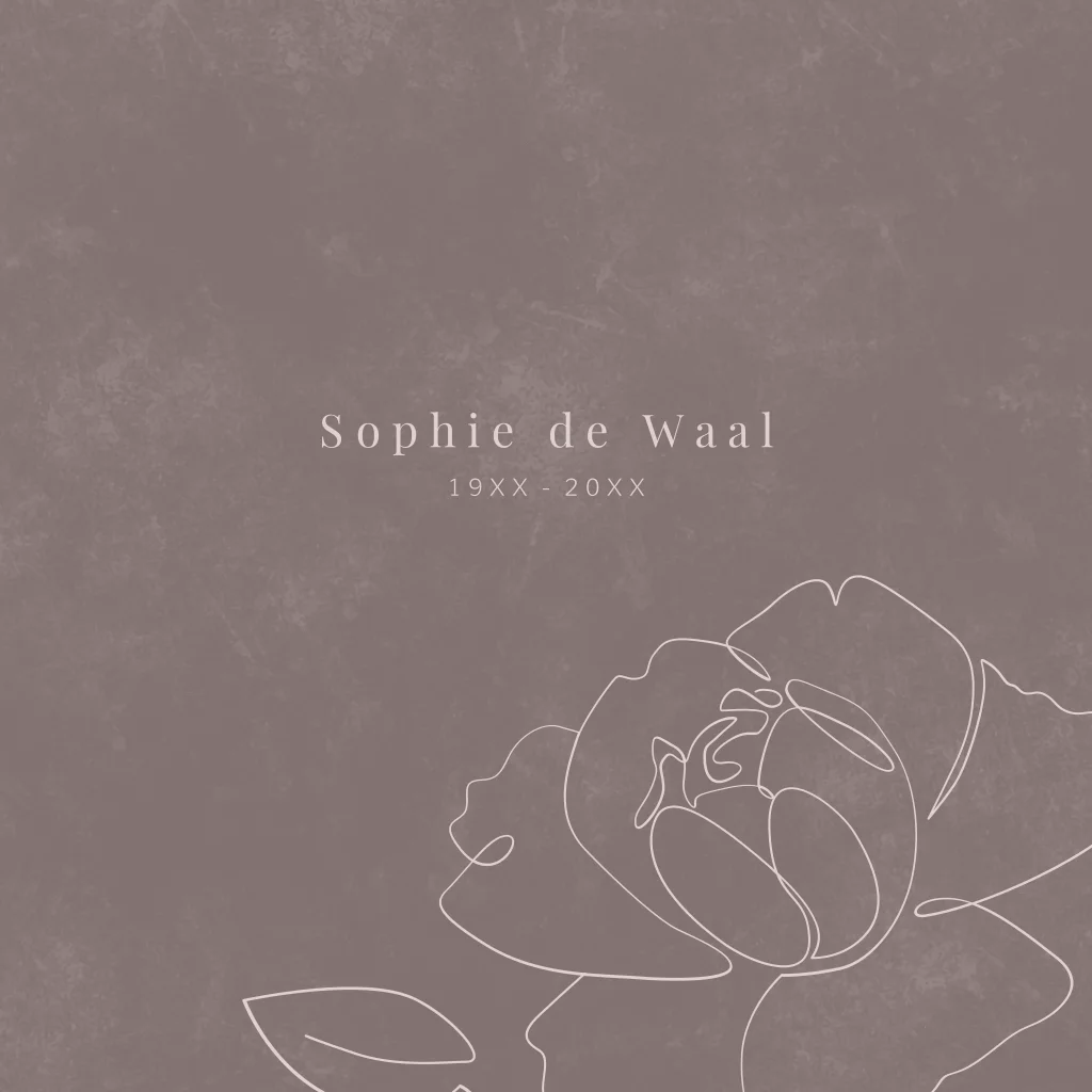 Stijlvolle rouwkaart met een oneline illustratie van een roos op een velvet achtergrond.