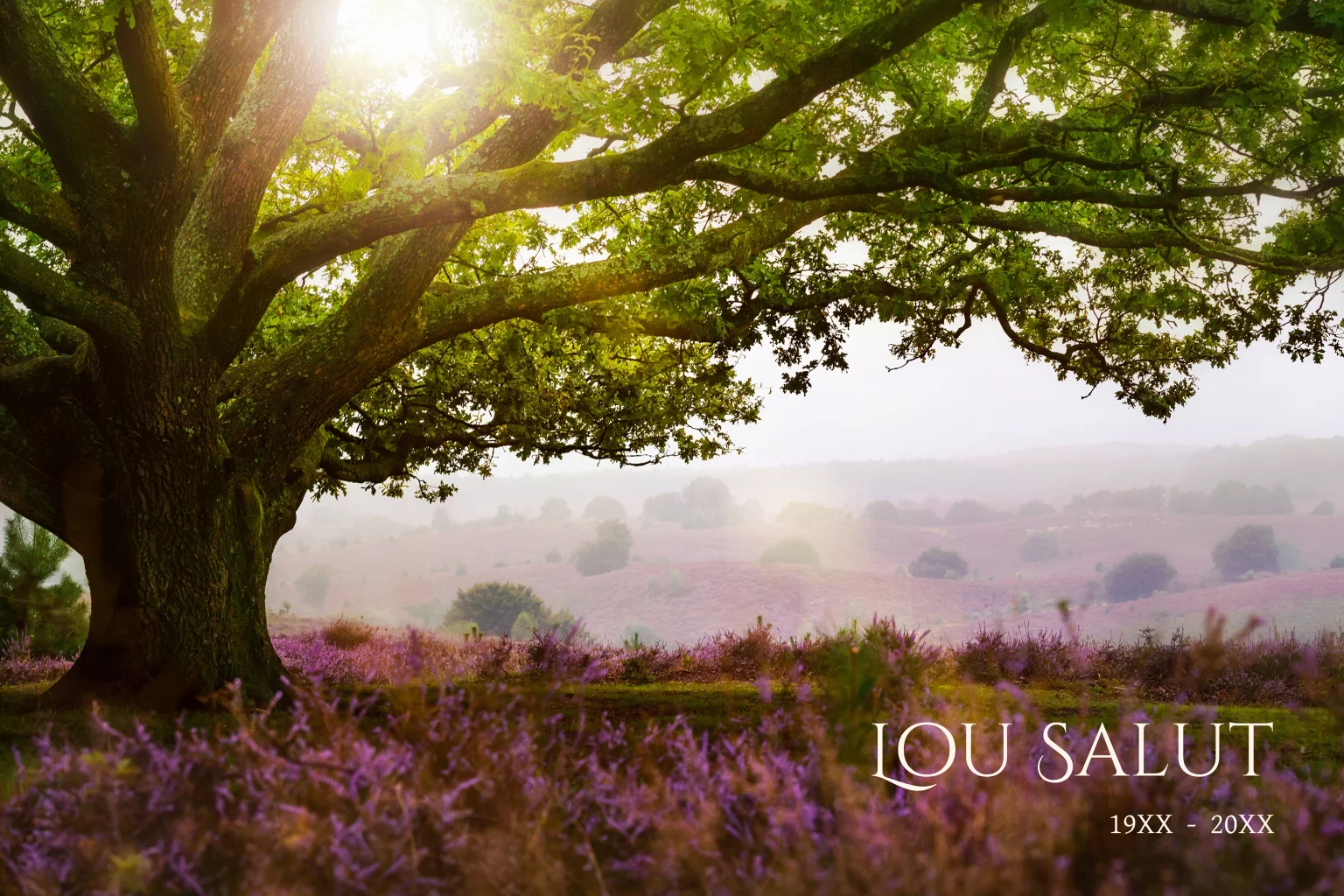 Rouwkaart met een sfeerfoto van een grote boom op de heide. Door de boomtakken komen de zonnestralen.
