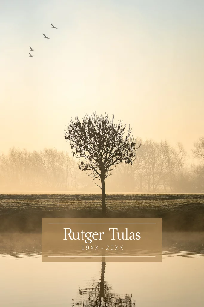 Overlijdenskaart met een sfeerfoto van een grote boom bij het water. Op de rouwkaart is een mooi herfst landschap met ochtenddauw te zien met in de verte een groep vogels in de lucht. Het silhouet van de boom, met kale takken, reflecteert in het meer.