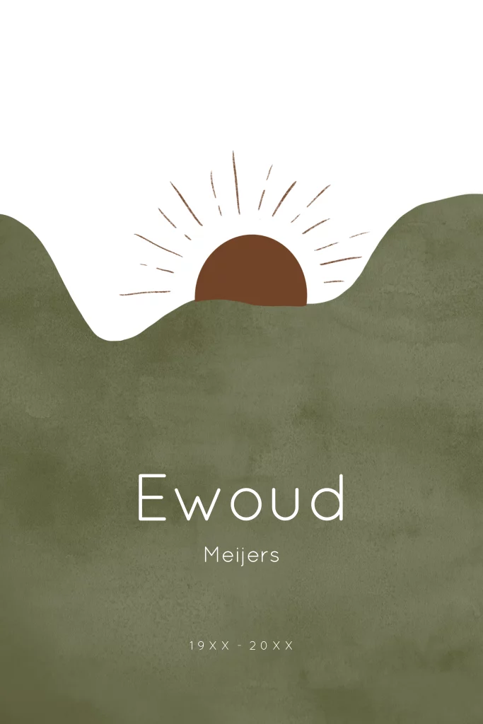 Een rustige rouwkaart met ondergaande zon. De foto aan de binnenzijde is makkelijk vervangbaar voor een eigen foto.