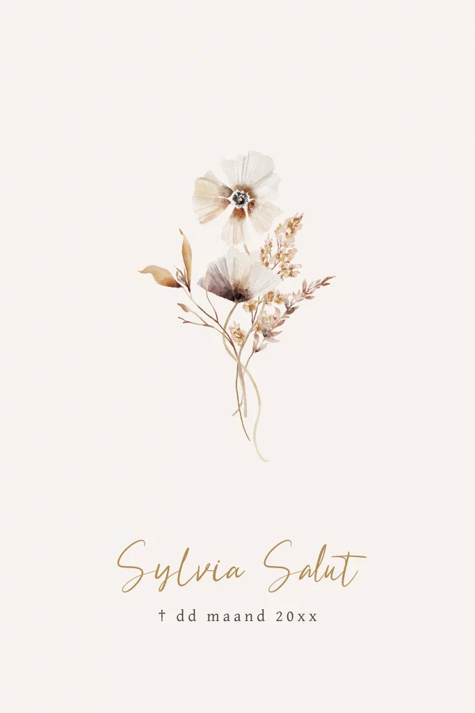 Rustige rouwkaart met natuurlijke kleuren en veldbloemen takjes. Op de binnenzijde is ruimte voor een foto.