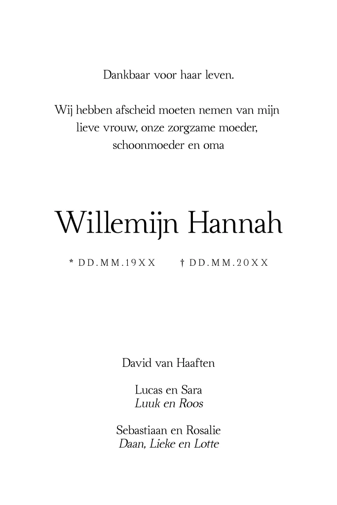 Een minimalistische en eenvoudige rouwkaart met geschetste bladeren en bloemen. De foto op de voorzijde is makkelijk vervangbaar voor een eigen foto.