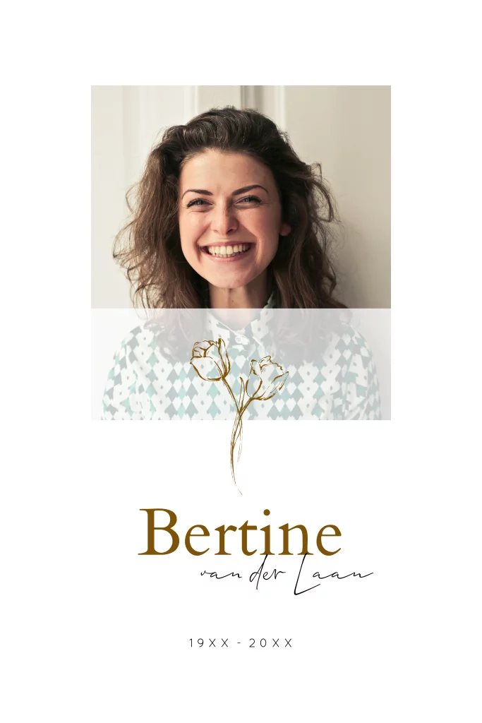 Een rustige rouwkaart met geschetste tulpen. De foto op de voorzijde is makkelijk vervangbaar voor een eigen foto.
