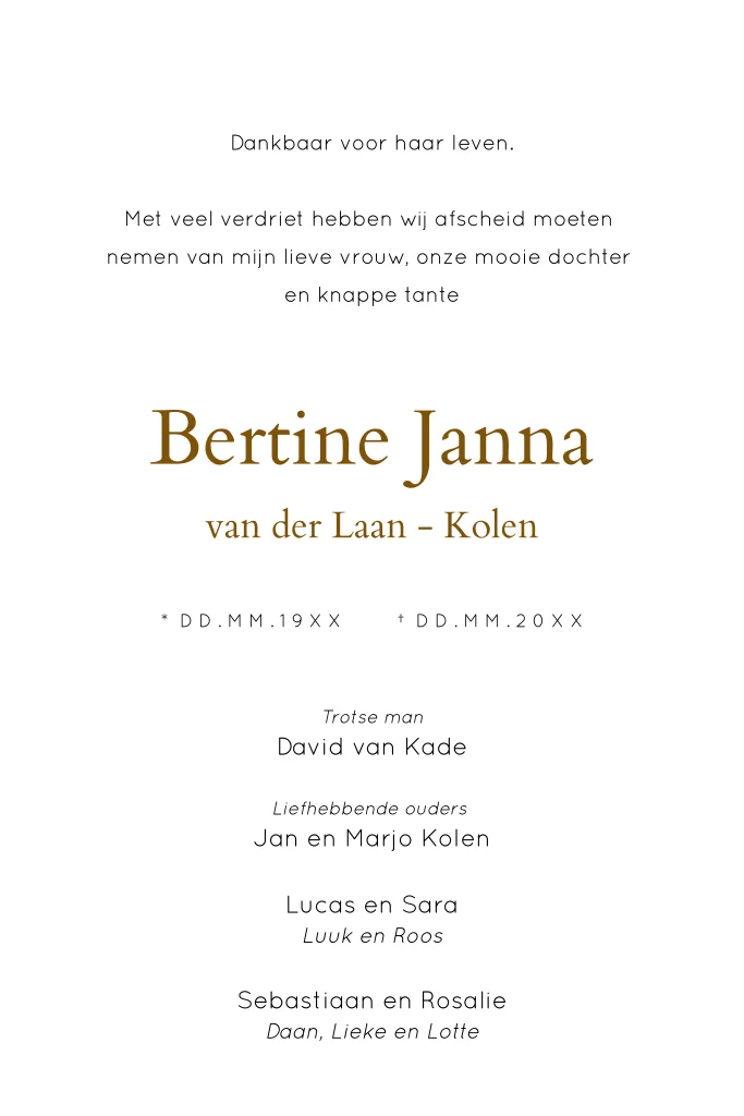 Upload een eigen foto. Pas de teksten, kleuren en lettertypes aan naar je eigen wens. Hulp nodig bij het opmaken van deze kaart? We helpen je er graag bij.
