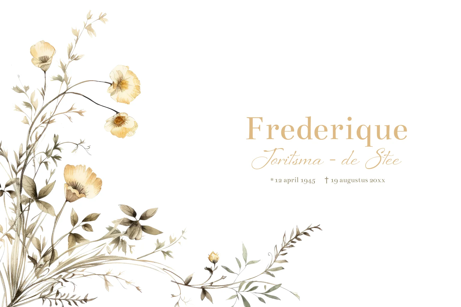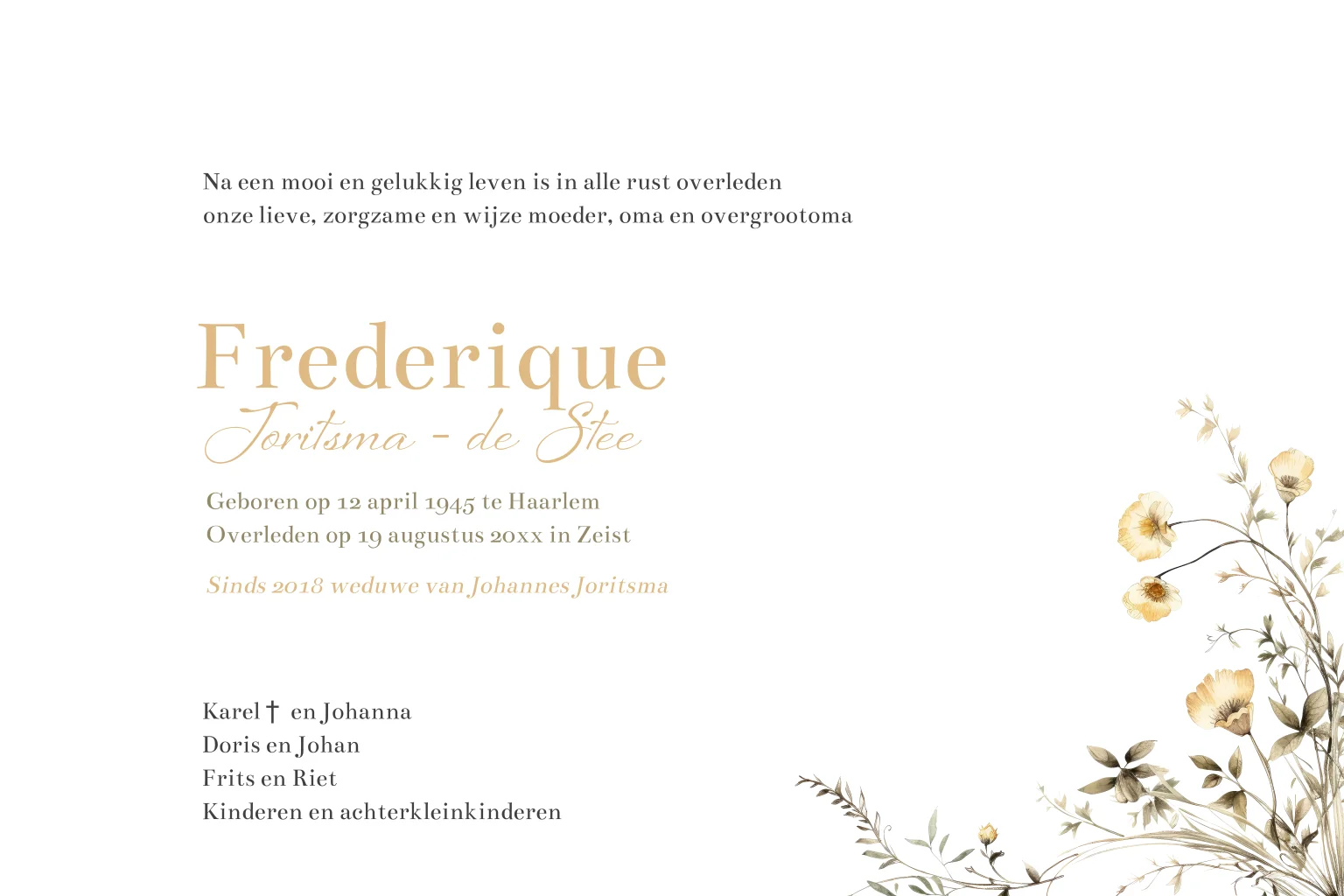 Deze rouwkaart voor een vrouw heeft prachtige olijfgroene en gele veldbloemen. De rouwkaart heeft een liggend dubbel formaat en een boeket van bloemen in de hoek. Op de binnenzijde komen deze veldbloemen en kleuren terug.